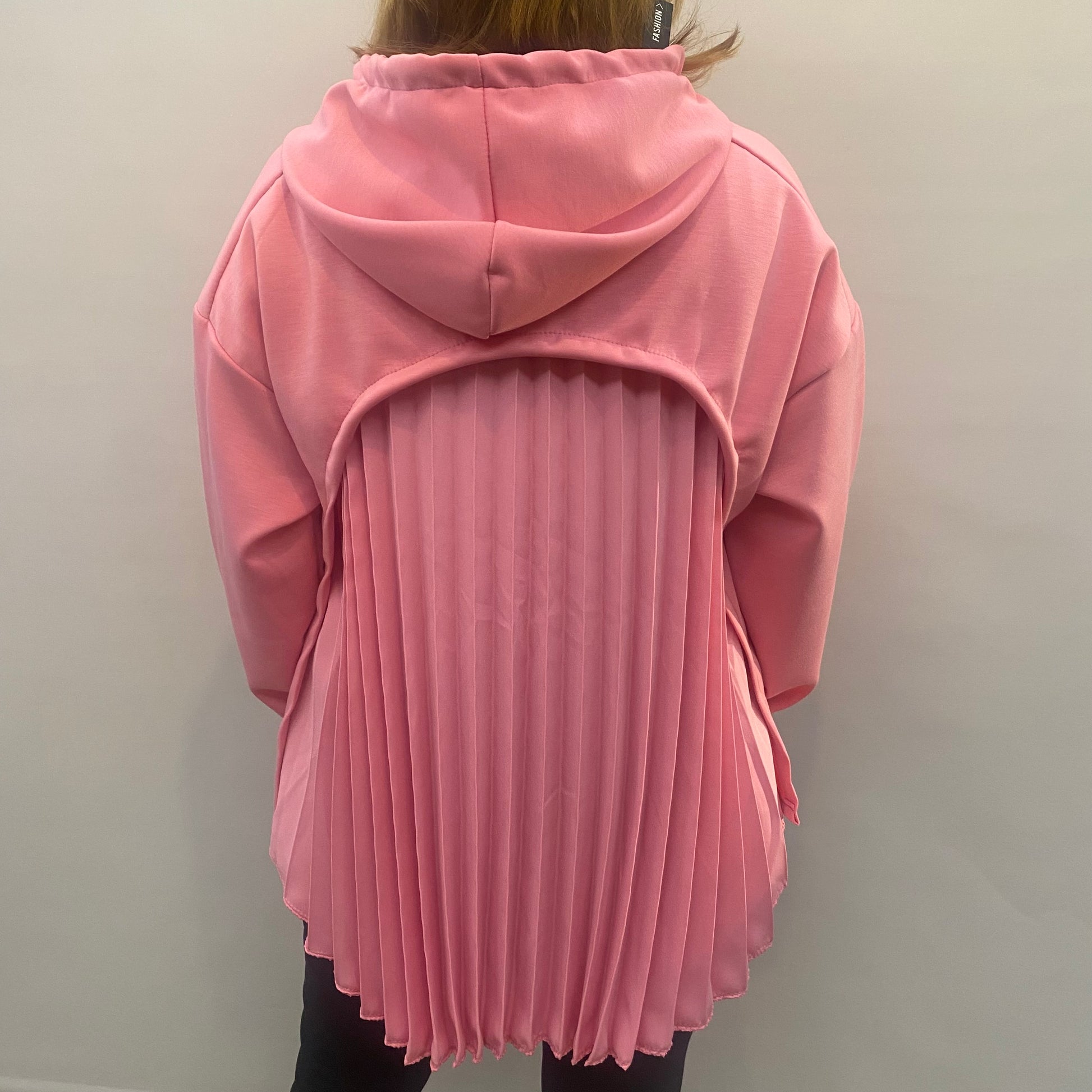 Rosa Hoodie mit Plissee-Einsatz im Rücken. Sportlich, feminin und modern – ein echtes Highlight für entspannte Everyday-Looks.